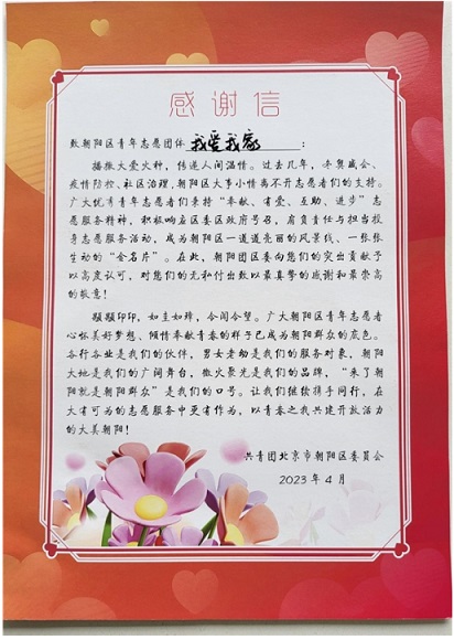 “廣大優(yōu)秀青年志愿者們秉持‘奉獻(xiàn)、有愛、互助、進(jìn)步’志愿服務(wù)精神,肩負(fù)責(zé)任與擔(dān)當(dāng)投身志愿服務(wù)活動,成為朝陽區(qū)一道道亮麗的風(fēng)景線、一張張生動的‘金名片’。在此,朝陽團(tuán)區(qū)委向您們的突出貢獻(xiàn)予以高度認(rèn)可,對您們的無私付出致以最真摯的感謝和最崇高的敬意……”。日前,我愛我家青年志愿服務(wù)隊收到了一份來自北京市朝陽團(tuán)區(qū)委的感謝信。