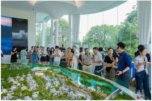 各路媒體、城市菁英人士、慕名而來的賓客齊聚桃花江畔,共同見證鳳凰來棲項目的開放盛況,F(xiàn)場嘉賓步入山水實景示范區(qū)進行參觀,身后青山層巒疊嶂,眼前景致無限風(fēng)光,示范區(qū)建筑的線條完美融合在群山云影之中,一山一水,一步一景,仿佛身處一幅山水畫卷之中,充滿詩情畫意。
