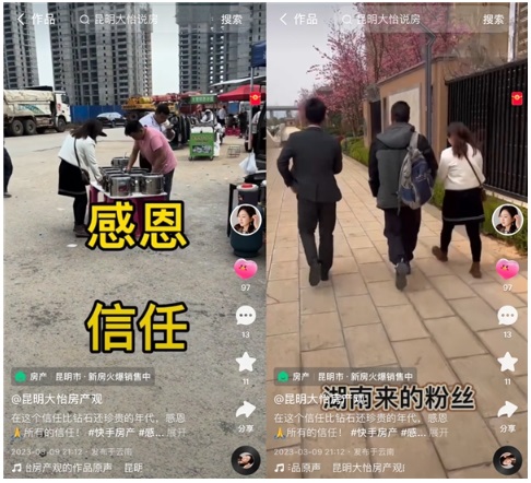 讓大怡感到榮幸的還有自己仿佛成了城市宣傳的窗口,“往小了說,我們的每天直播是為了賣房子,幫更多人找到理想家,但往大了說,直播能夠輻射到全國,在推薦房子的同時(shí),也在宣傳宜居的昆明,介紹這里得天獨(dú)厚的氣候,適合旅行、康養(yǎng)的自然條件。我有70%的客戶都是從外省過來的,通過我們小小的主播就能促進(jìn)城市人口的流入,這在以前是想都不敢想的,毫不夸張的講,快手真的改變了我的命運(yùn)”。
