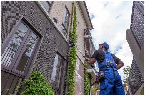 圖為家居服務(wù)師清潔別墅外墻