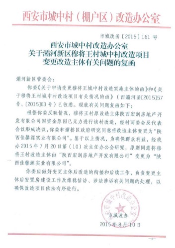 (西安市城改辦下發(fā)的《關(guān)于灞河新區(qū)穆將王村城中村改造項(xiàng)目變更改造主體有關(guān)問(wèn)題的復(fù)函》)