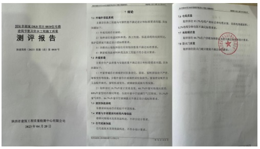 記者查閱到一份由陜西省建筑工程質(zhì)量檢測(cè)中心有限公司出具的編號(hào)陜建筑(2023)技服(政)第0010號(hào)的《測(cè)評(píng)報(bào)告》。報(bào)告顯示,DK8所建4棟樓房的房屋外墻、門(mén)窗、消防設(shè)施及所使用的電線電纜、水暖工程等均為不合格工程,使用的材料均為不合格和不達(dá)標(biāo)的材料。
