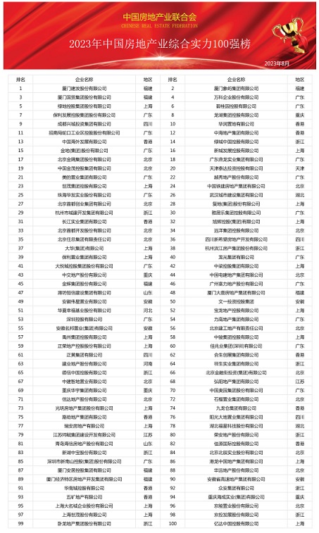 近日,2023年中國房地產(chǎn)業(yè)綜合實(shí)力100強(qiáng)排行榜發(fā)布,這是中國房地產(chǎn)業(yè)聯(lián)合會對房地產(chǎn)行業(yè)進(jìn)行全面、科學(xué)、獨(dú)立的企業(yè)實(shí)力發(fā)展調(diào)查研究宣傳發(fā)布工作。通過對全國34個(gè)。▍^(qū)、市)超過2500家利潤總額在5000萬元至300億元之間的中國房地產(chǎn)開發(fā)企業(yè)進(jìn)行了數(shù)據(jù)采集研究,比照國際上通行的做法,主要根據(jù)營業(yè)收入、資產(chǎn)總額、利潤總額、資信等級、社會貢獻(xiàn)、業(yè)主滿意度等指標(biāo)分析確定候選企業(yè),邀請100位企業(yè)高管、學(xué)者及官員對經(jīng)資格審核符合要求的企業(yè)進(jìn)行綜合評分,并對部分候選企業(yè)進(jìn)行實(shí)地拜訪,從中遴選出100家中國房地產(chǎn)業(yè)綜合實(shí)力100強(qiáng)企業(yè)。在此基礎(chǔ)上通過與世界500強(qiáng)企業(yè)進(jìn)行綜合對比分析,進(jìn)而有針對性地提出促進(jìn)企業(yè)做強(qiáng)、做優(yōu)、做大的策略建議,在全國范圍內(nèi)形成了巨大的社會影響力。