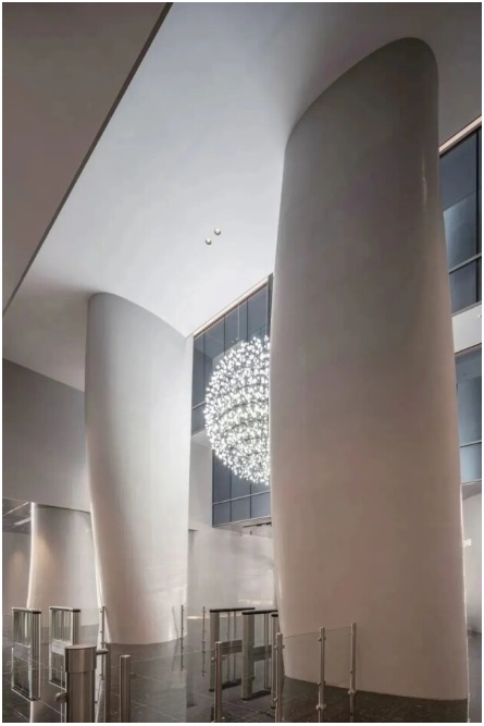 利用建筑結(jié)構(gòu)特點,設(shè)計在橫向尺度有限的條件下大膽嘗試,盡可能的拓寬室內(nèi)空間的縱向尺度。結(jié)合裙樓天窗及鏡面天花材質(zhì),最終呈現(xiàn)出獨特的空間尺度和光影關(guān)系。細(xì)節(jié)部分采用數(shù)字化設(shè)計手段,結(jié)合廠家生產(chǎn)工藝?yán)枚嗲媸陌⒅男螒B(tài),將原有的常規(guī)建筑柱網(wǎng)打造成具有藝術(shù)美感的雕塑整列。