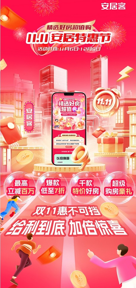 一年一度的雙十一購物狂歡季如約而至, 在 2024 全國樓市新政利好的大背景下,58同城、安居客積極響應市場需求,重磅推出 “11.11安居特惠節(jié)”(以下簡稱安居特惠節(jié));顒訌11月6日至12月5日,持續(xù)一個月鉅惠不斷,攜手全國百家品牌開發(fā)商,打造“精選好房超值購 ”的購房置業(yè)狂歡季。安居客作為國內領先的房產服務平臺,一直以來都致力于為客戶提供優(yōu)質全面的房產服務。此次的安居特惠節(jié),更是充分發(fā)揮平臺優(yōu)勢,整合各方資源,匯聚海量優(yōu)質房源,為購房者打造一場優(yōu)惠力度拉滿的房產盛宴。