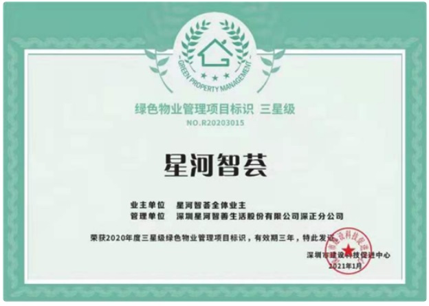 經(jīng)過(guò)1年的籌備,深圳星河智薈通過(guò)環(huán)境建設(shè)、設(shè)施設(shè)備提升、公區(qū)照明改造、非傳統(tǒng)用水回收裝置研發(fā)、垃圾分類工作等多個(gè)方面工作的開(kāi)展,終于在2020年12月,獲得深圳市建設(shè)科技促進(jìn)中心頒發(fā)的“綠色物業(yè)管理項(xiàng)目三星級(jí)標(biāo)識(shí)”。