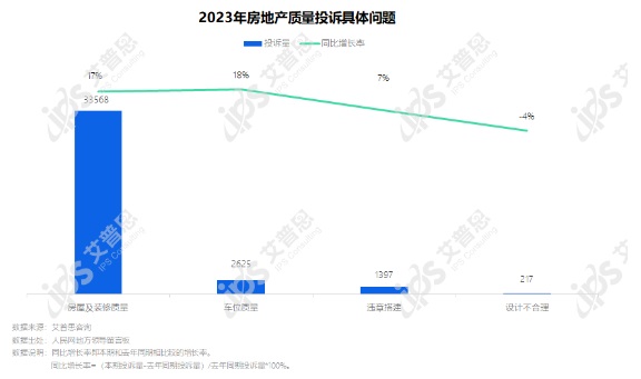2023年,質(zhì)量投訴中房屋及裝修質(zhì)量相關(guān)投訴33568起,較去年增長(zhǎng)17%;車位質(zhì)量相關(guān)投訴2625起,較去年增長(zhǎng)18%;違章搭建、設(shè)計(jì)不合理相關(guān)投訴分別為1397起、217起。