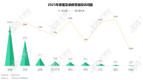 本年度房屋及裝修質(zhì)量投訴中主要問(wèn)題為滲漏、開裂,相關(guān)投訴量分別為10599起、6713起,分別較去年增長(zhǎng)8%、24%,塌陷、隔音相關(guān)投訴分別同比增長(zhǎng)25%、27%。