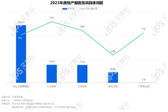 服務(wù)類投訴中,物業(yè)及配套服務(wù)投訴量36614起,較去年增長(zhǎng)8%,其中亂用維修基金、亂收電費(fèi)、物業(yè)不作為等問(wèn)題投訴較多;辦證服務(wù)投訴量11526起,較去年大幅增長(zhǎng)26%,主要投訴問(wèn)題為無(wú)法辦理房產(chǎn)證;交房服務(wù)投訴11432起,較去年增長(zhǎng)14%,主要涉及延期交房;服務(wù)態(tài)度相關(guān)投訴6889起,較去年下降21%,工作人員辦事推脫、拖延相關(guān)投訴較多。