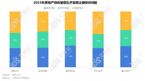 從投訴分類來(lái)看,2023年融創(chuàng)中國(guó)、建業(yè)地產(chǎn)服務(wù)問(wèn)題相關(guān)投訴居多,占比分別為39%、38%;碧桂園、萬(wàn)科地產(chǎn)質(zhì)量問(wèn)題相關(guān)投訴較多,分別占比38%、41%。