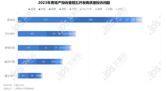 2023年,投訴量前五開發(fā)商質(zhì)量投訴具體問(wèn)題中,滲漏、開裂為主要問(wèn)題,碧桂園收到滲漏相關(guān)投訴314起、開裂相關(guān)投訴186起,萬(wàn)科地產(chǎn)收到的滲漏、開裂相關(guān)投訴分別為162起、83起;綠地控股收到的滲漏、開裂相關(guān)投訴分別為119起、81起。