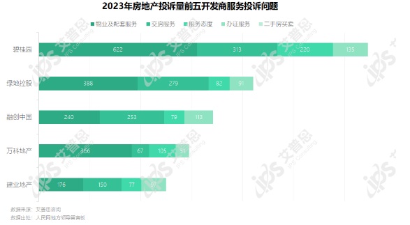 服務(wù)投訴方面,碧桂園收到的物業(yè)及配套服務(wù)、交房服務(wù)、服務(wù)態(tài)度、辦證服務(wù)相關(guān)投訴均較多,都在100起以上;萬(wàn)科地產(chǎn)被訴問(wèn)題主要集中在物業(yè)及配套服務(wù)、服務(wù)態(tài)度,投訴量分別為366起、105起;除碧桂園外,融創(chuàng)中國(guó)、建業(yè)地產(chǎn)收到的辦證服務(wù)相關(guān)投訴也較多。