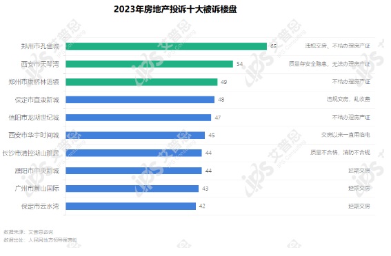 2023年被投訴最多的樓盤為鄭州市孔雀城,共收到投訴65起,主要投訴問(wèn)題為違規(guī)交房、不給辦理房產(chǎn)證。