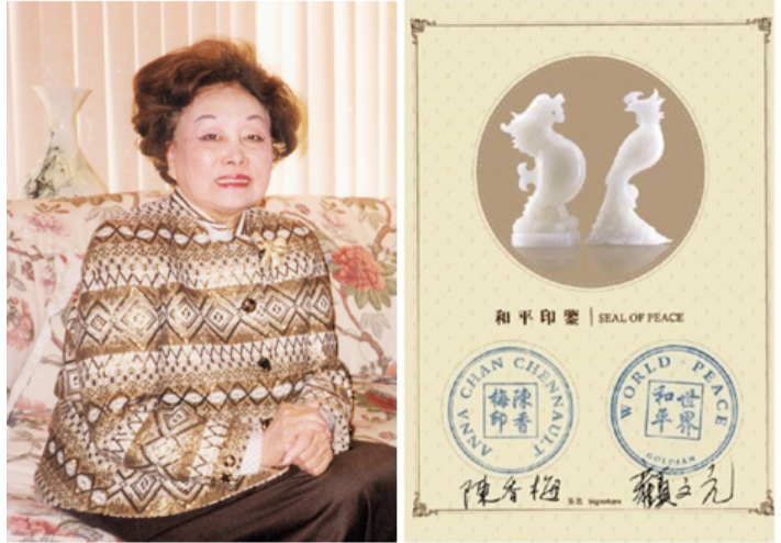 陳香梅女士在海馬龍和平印鑒上簽字