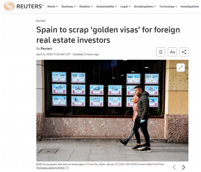 當(dāng)?shù)貢r(shí)間4月8日,西班牙首相桑切斯毫無(wú)預(yù)警地宣布,政府將終止面向非歐盟購(gòu)房者的“黃金簽證”計(jì)劃。
