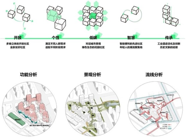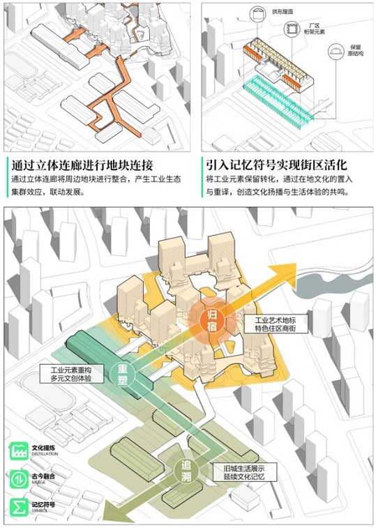 以“喚起、轉(zhuǎn)化、植入”為思路,將工業(yè)元素保留轉(zhuǎn)化,以“追溯、重塑、歸宿”為主題,連接路徑,聯(lián)合空間,與城市空間與歷史友好互動。