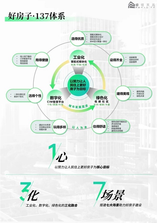 如何全方位實施“好房子”建設(shè),全面提高住宅建筑產(chǎn)品品質(zhì)?睿住天元設(shè)計團隊打造了「好房子·137體系」。圍繞“以努力讓人民住上更好房子”一大核心目標,“工業(yè)化、數(shù)字化、綠色化“三化融合設(shè)計手法,搭建“七大場景”助力好房子建設(shè)。