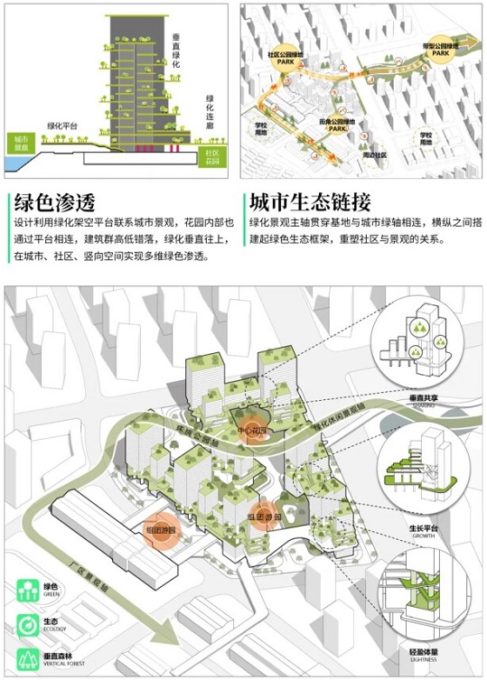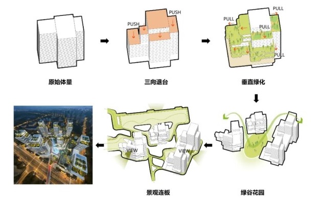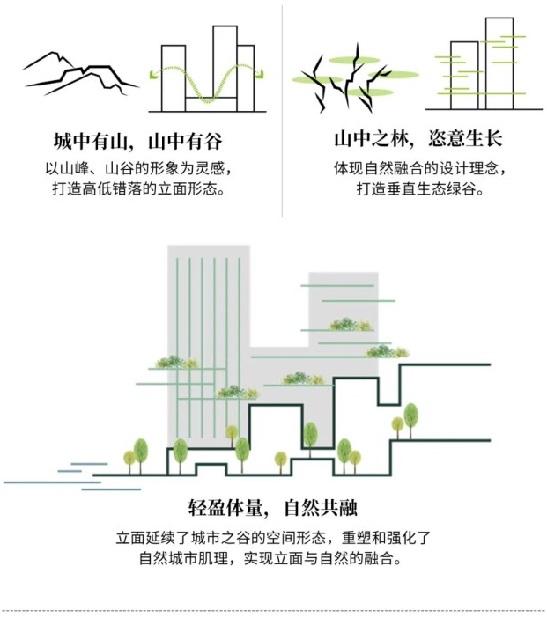 立面以群山為靈感,通過高低、形態(tài)的變化與組合,采用地面、平臺與屋頂垂直綠化相結(jié)合的方式,打造了一個立體多層次的城市綠谷形象。