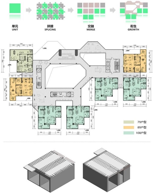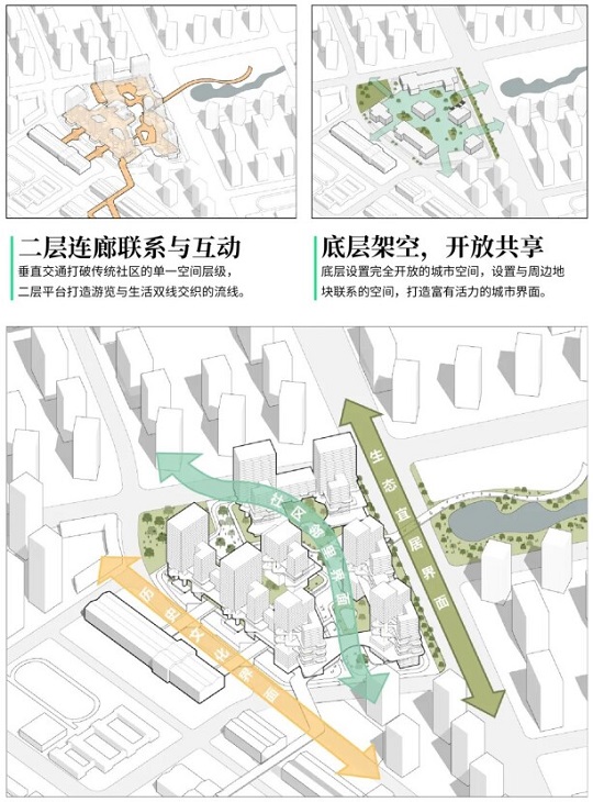 將單元化的居住空間進行自由組合并與社區(qū)功能相融合,利用連廊、大板形成二層平臺,高大的架空層與灰空間提供了鮮活、親密、多樣的開放活動空間。打破傳統(tǒng)的居住方式,利用同層共享社區(qū)、豎向公共交往空間,營造微社區(qū)生活模式。