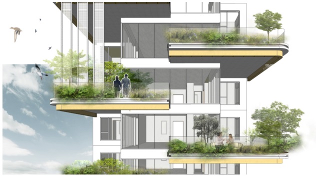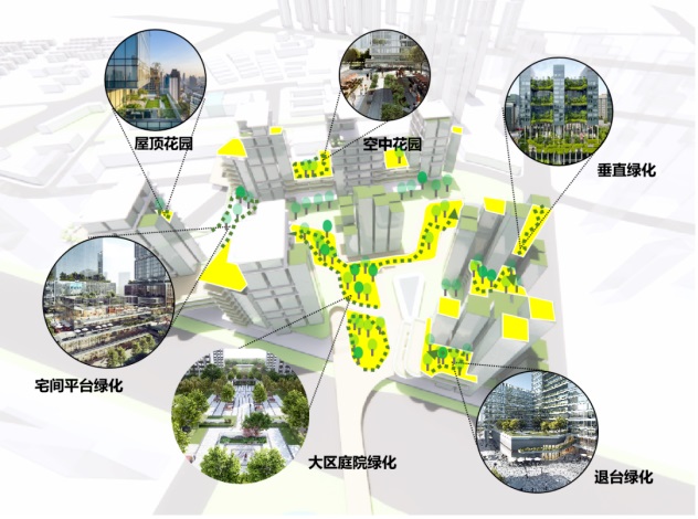 融合大區(qū)庭院綠化、宅間平臺綠化、空中花園綠化、退臺綠化、垂直綠化、屋頂花園綠化等多個綠色生態(tài)場景,打造多層次的綠化開放空間系統(tǒng),降低場地?zé)釐u效應(yīng),創(chuàng)造有利的場地微氣候,降低建筑外圍護結(jié)構(gòu)表面溫度與室內(nèi)空調(diào)負荷,節(jié)能環(huán)保。