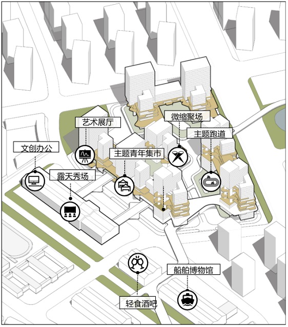 以工業(yè)記憶符號為元素,激活主題性特色商業(yè)街區(qū),吸引人群。賦予多元業(yè)態(tài)高效組合,形成多場景集合的城市美好生活聚點。