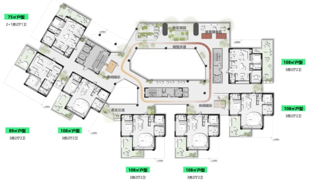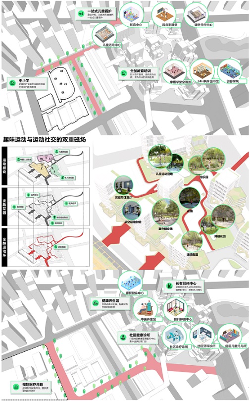 整合教育文化資源,新建圖書館、創(chuàng)客學(xué)院、幸福學(xué)堂、托育中心等,實現(xiàn)“全齡化”教育覆蓋。社區(qū)運動系統(tǒng),將跑道、運動場、游憩場等場地串聯(lián)成運動社交場所,激發(fā)社區(qū)活力,能讓參與者得到運動與社交帶來的加倍滿足。整合醫(yī)療資源,新建長者照料中心、社區(qū)健康診所、健康養(yǎng)生館等,打造全齡化健康醫(yī)療服務(wù)。