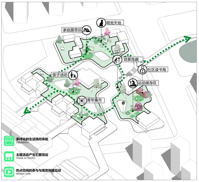 因地制宜的構(gòu)建以社區(qū)中心綠廊為骨架的空間結(jié)構(gòu),連接住區(qū)與公園、城市綠軸,并營造出一系列親切、實用、功能靈活的景觀綠化空間。
