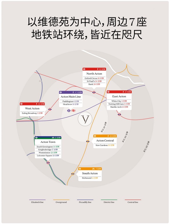 從維德苑啟程,僅需步行約2.2 公里,即可抵達皮卡迪利線與區(qū)域線交匯的Acton Town站,這里可以輕松抵達南肯辛頓(South Kensington)、騎士橋(Knightsbridge)、威斯敏斯特(Westminster)和萊斯特廣場(Leicester Square)等多個倫敦標(biāo)志性地點;中央線與維德苑的聯(lián)系更加緊密,有3個站點緊靠維德苑,其中North Acton站只需步行1公里即可抵達;距離最近的伊麗莎白線更是讓倫敦市中心和國際門戶都變得觸手可及,從維德苑出發(fā)只需步行不到1分鐘,便可以踏上的伊麗莎白線,6分鐘即可去到帕丁頓(Paddington),18分鐘可抵達希思羅機場。