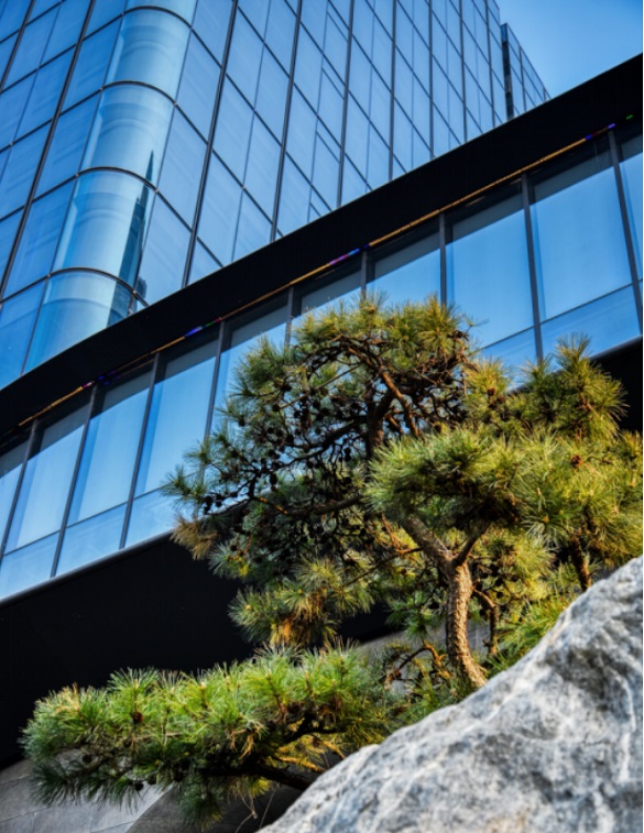 除此之外,麗金智地中心還于園區(qū)之內(nèi)打造了一處鬧中取靜的立體山水園林。項目自中國古代山水畫中汲取靈感,將現(xiàn)代詩意之美鐫刻在山水之境,最終呈現(xiàn)出的園林包含臺地、山石、水系、植被等豐富的元素,體現(xiàn)出東方特有的禪意韻味,搭配大堂框架式無肋大玻璃幕墻系統(tǒng),建筑內(nèi)外空間界限交錯,室外的山水美景引入大堂之中,為快節(jié)奏的辦公場所平添自然寫意。