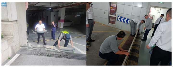 為了抵御暴雨,物業(yè)人員爭(zhēng)分奪秒地放置沙袋,安裝防汛擋板,以最快的速度攔截積水。