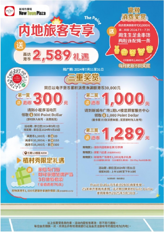 最硬核的當(dāng)屬暑期檔香港沙田新城市廣場(chǎng)特別策劃推出的「The Point 暑假旅客」內(nèi)地旅客專享三重獎(jiǎng)賞計(jì)劃,高達(dá)港幣2,589禮遇,消費(fèi)滿30,000港幣即可獲得額外三重禮加贈(zèng),福利超多,誠(chéng)意滿滿。