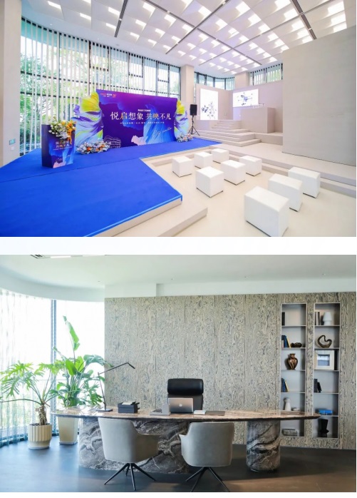 項(xiàng)目領(lǐng)導(dǎo)陪同來(lái)訪嘉賓一同參觀了樣板間。踏入樣板間,仿佛穿越到未來(lái)的商務(wù)辦公場(chǎng)景之中。約7.2米挑高首層大廳,以企業(yè)名片般的首道空間呈現(xiàn),讓來(lái)訪者直觀感受到企業(yè)的實(shí)力;辦公區(qū)內(nèi)靈活多變的交流空間、綠色生態(tài)的辦公空間,以人文色彩賦予商務(wù)空間不一般的體驗(yàn);緊隨時(shí)代潮流打造的直播間、實(shí)驗(yàn)室,開(kāi)拓了企業(yè)展示自我的新平臺(tái);獨(dú)立總裁層,規(guī)劃辦公室、會(huì)議室、茶室等功能空間,隨時(shí)開(kāi)啟商務(wù)會(huì)晤……從空間布局到創(chuàng)新設(shè)計(jì),每一處設(shè)計(jì)都蘊(yùn)含著匠心巧思,無(wú)一不透露著對(duì)未來(lái)商務(wù)空間的創(chuàng)新引領(lǐng)。這也引得參觀者紛紛駐足,無(wú)不贊嘆設(shè)計(jì)師的巧妙構(gòu)思與項(xiàng)目的非凡品質(zhì)。