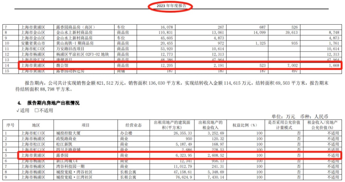 (城投控股2023年年報(bào),新增在售商品房馥公館,露香園出租商業(yè)面積剩余6233.95㎡)