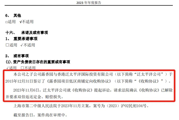 雖然目前官網(wǎng)上尚未披露案件詳情,但從上海城投2023年年報(bào)也能窺得一二。據(jù)其年報(bào),2015年,上海城投就露香園低區(qū)商鋪與香港泛太平洋國(guó)際投資有限公司(以下簡(jiǎn)稱“泛太平洋公司”)簽訂《露香園項(xiàng)目低區(qū)商品定向售樓協(xié)議》(以下簡(jiǎn)稱“收購(gòu)協(xié)議”),2023年11月,泛太平洋公司就《收購(gòu)協(xié)議》提起訴訟,要求法院確認(rèn)《收購(gòu)協(xié)議》已解除,并要求雙倍返還定金、賠償損失。