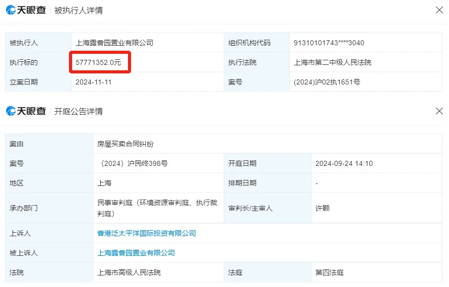 2024年底,露香園項(xiàng)目公司上海露香園置業(yè)有限公司(以下簡(jiǎn)稱“露香園置業(yè)”)成為被執(zhí)行人,執(zhí)行標(biāo)的高達(dá)5777萬(wàn)元。