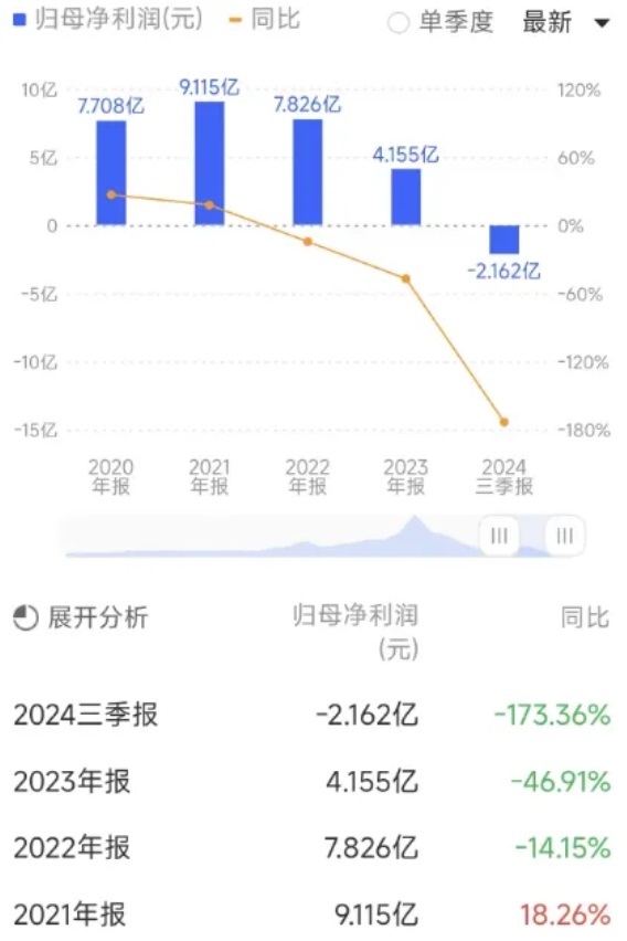 據(jù)上海城投旗下上市主體城投控股年報(bào),從2021年至今,城投控股歸母凈利潤(rùn)連年下降,尤其到了2024年,其歸母凈利開(kāi)始虧損,三季報(bào)顯示,城投控股虧損額2.162億元,同比下跌173.36%。