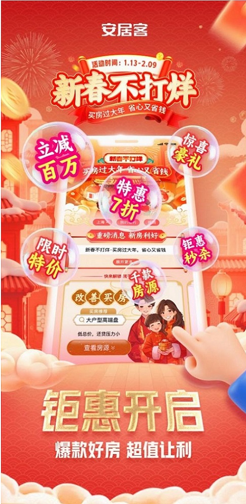 春節(jié),是中華民族每年最重要的傳統(tǒng)節(jié)日,也是游子歸鄉(xiāng)、闔家團(tuán)圓的溫馨時(shí)刻,人們對(duì)于家的渴望愈發(fā)強(qiáng)烈,購(gòu)房置業(yè)的需求也隨之高漲。為了滿足廣大購(gòu)房者在春節(jié)期間的購(gòu)房需求,58同城、安居客特別推出“新春不打烊”活動(dòng);顒(dòng)從1月13日至2月9日,旨在搭建一個(gè)便捷、高效的購(gòu)房渠道,讓購(gòu)房者在春節(jié)期間能夠輕松選房、安心購(gòu)房,實(shí)現(xiàn)新春置業(yè)夢(mèng)想,開啟幸福新生活。