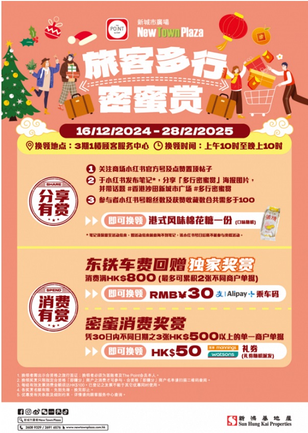 一簽多行啟動后,赴港旅客激增,香港沙田新城市廣場趁勢推出年終矩獻(xiàn)活動-旅客多行密蜜賞,通過旅客互動與參與,分享與消費(fèi),多重驚喜獎(jiǎng)賞加持,體驗(yàn)在香港沙田新城市廣場一站式購物狂歡。即日起至2025年2月28日,香港沙田新城市廣場推出雙重活動分享有賞與消費(fèi)有賞。旅客可通過邊逛邊參與的方式,增加年終購物的樂趣與驚喜。分享有賞:關(guān)注商城小紅書,分享「多行密蜜賞」圖片并發(fā)布筆記,帶相應(yīng)話題,即可免費(fèi)領(lǐng)取港式風(fēng)味棉花糖一份。消費(fèi)有賞:在香港沙田新城市廣場消費(fèi)滿800元,即可領(lǐng)取30元支付寶東鐵車票乘車禮贈,承包你的路費(fèi)獎(jiǎng)賞。憑30日內(nèi)三次以上滿額消費(fèi)單據(jù),即可獲贈 50元萬寧或屈臣氏禮券。