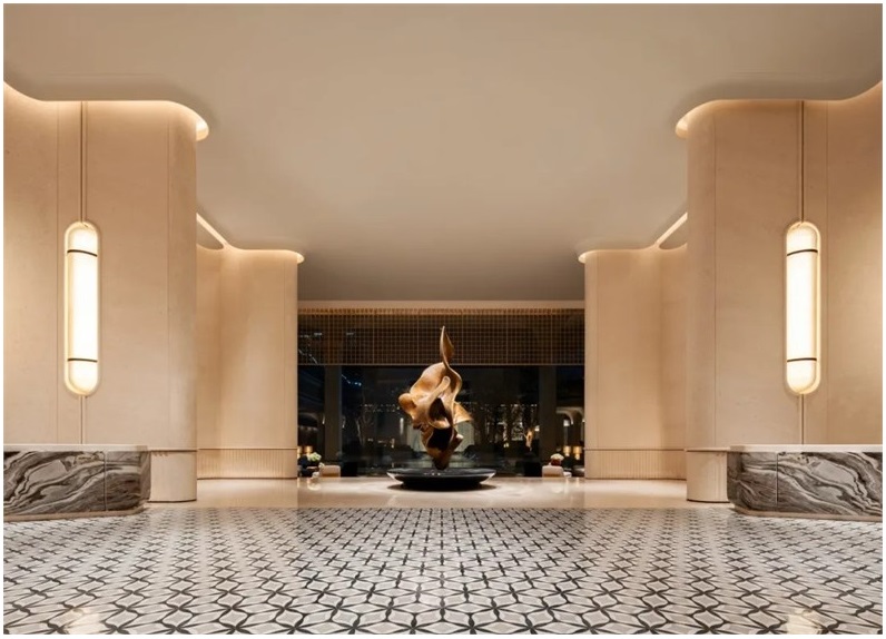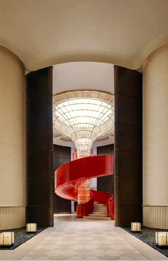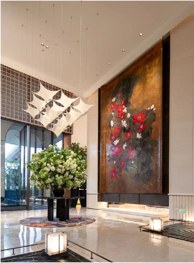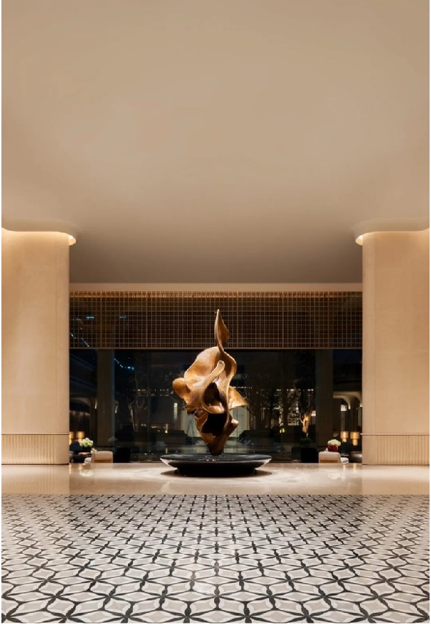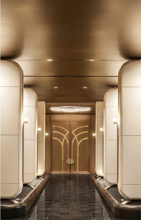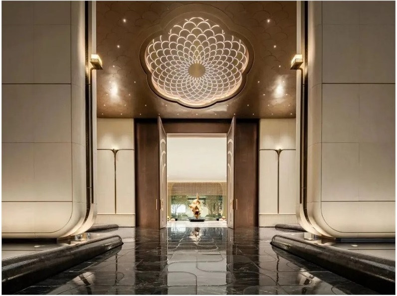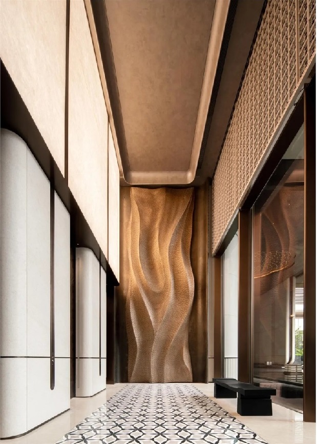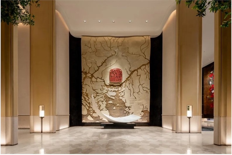 “非遺銅門”|約7.5米高的“非遺銅門”,是由中國國寶級非遺大師朱炳仁首創(chuàng)。在大門蝕刻工藝的基礎上刻畫生命之樹,銅門兩側(cè)融合了非遺錘紋鍛造工藝;門把手采用掐絲琺瑯與鏨刻工藝。