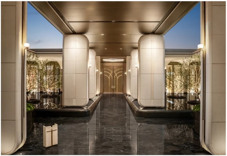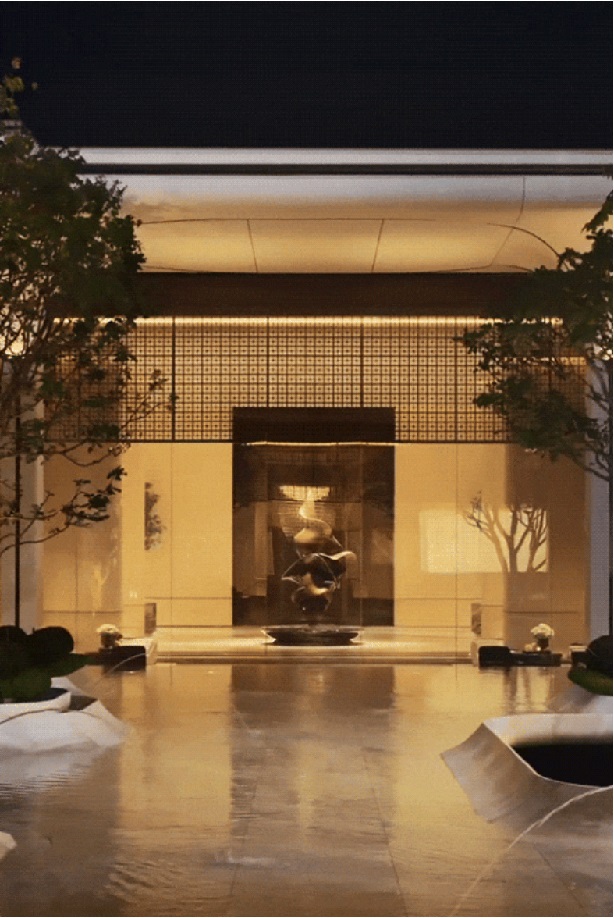 歸家一進院的水庭底部由安哥拉黑奢石打造,曲水納福,門庭富貴。兩旁六顆紅果冬青樹,樹齡近百年,枝繁葉茂。正面是由宇宙黑金奢石打造的照壁,寓意著江浪奔涌不息,是極富尊貴感的歸家門面。