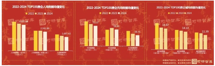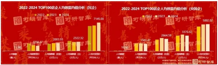 TOP100房企大部分效能數(shù)據(jù)均值下降,2024年TOP100房企人均全口徑銷售額均值3200萬,人均權益銷售額2300萬,元均權益銷售額58.9元,民營企業(yè)部分數(shù)據(jù)出現(xiàn)探底狀態(tài)。
