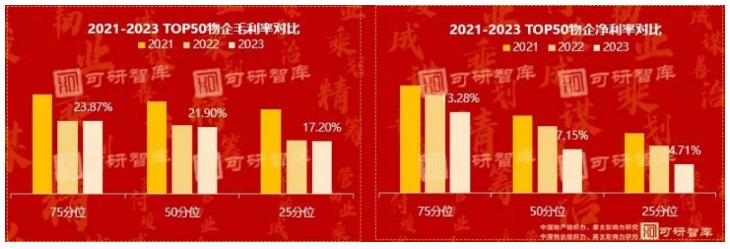 2023年,物企面臨著較大的盈利能力挑戰(zhàn),毛利率持續(xù)走低,TOP50 物企的毛利中位值穩(wěn)定在 16.8%,凈利率也緊隨其后持續(xù)下行,中位值為 7.15%。