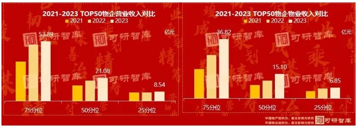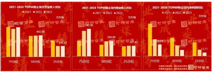 2023年,TOP50 物企的項均營收與物收分化特征顯著,頭部企業(yè)增長勢頭迅猛,而后位企業(yè)的增幅逐漸放緩。物企品牌效應的優(yōu)勢在這一過程中展現(xiàn)得淋漓盡致,這與 2022 - 2023 年可研智庫所倡導的構建物企品牌成熟度發(fā)展策略高度吻合。