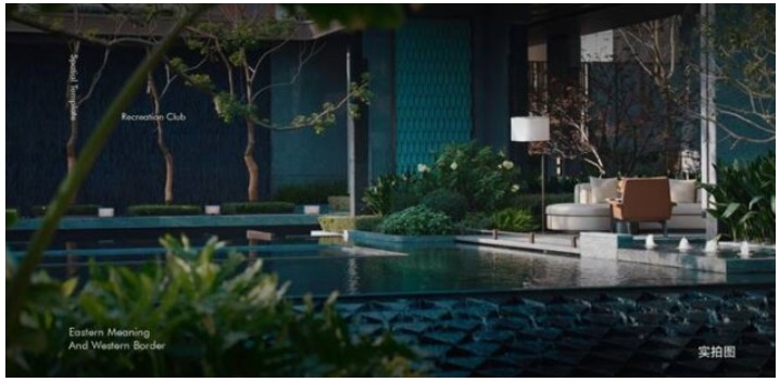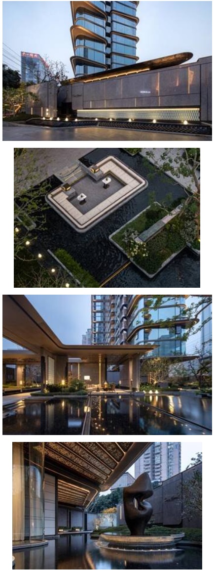 入口處,海藍寶花崗石整雕而成的波浪板圍墻,每一塊需耗時一周以上精雕細琢;金屬鐵藝以類榫卯工藝拼接,焊點隱匿無痕。步入內(nèi)庭,水景潺湲。水落之處的弧度與聲響,都經(jīng)「藏錦」設計團隊反復調試,最終成型。