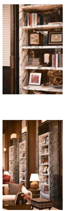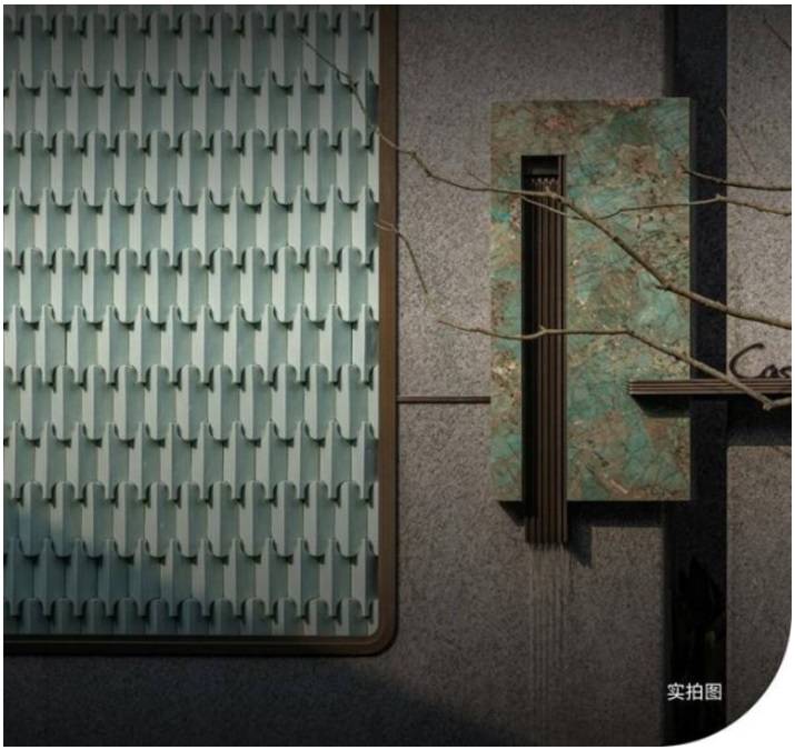 景墻一側的黃金比例處,“石中愛馬仕”亞馬遜綠奢石與汝窯瓷片景墻珠聯(lián)璧合,相得益彰。流水、瓷光、奢石、楓影于「藏錦」,共織一席。