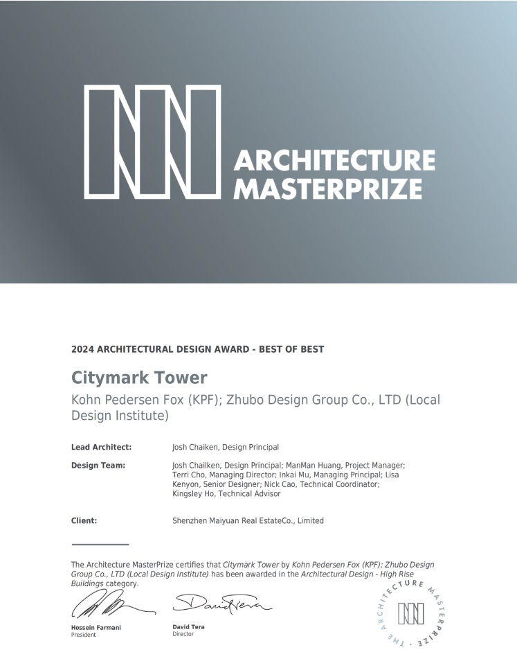 Architecture MasterPrize 美國建筑大師獎(jiǎng)前身為AAP美國建筑獎(jiǎng),是最具權(quán)威的建筑獎(jiǎng)項(xiàng)之一,旨在表彰全球最優(yōu)秀、最有創(chuàng)意的建筑、室內(nèi)和景觀項(xiàng)目。據(jù)官方數(shù)據(jù)報(bào)道,本屆AMP賽事共吸引了81國家和地區(qū),城脈中心從全球頂尖水平的數(shù)千份作品中脫穎而出,摘獲最佳高層建筑獎(jiǎng),取得最高級(jí)別榮譽(yù)[Best of Best]。是深圳地標(biāo)實(shí)力再一次擲地有聲的證言,更是中國超高層建筑進(jìn)階發(fā)展的又一歷史時(shí)刻。