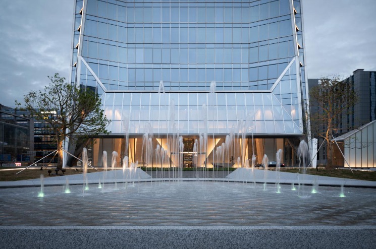 由AECOM擔(dān)任設(shè)計(jì)的“都市哲疊”中央景觀廣場,以水景,四時(shí)景觀禮序共融,營造賓至如歸的辦公場景;東廣場設(shè)置聚會(huì)和休憩空間,西廣場結(jié)合穹頂一體式雨棚,與立面折面設(shè)計(jì)相呼應(yīng),打造無風(fēng)雨落客平臺(tái);