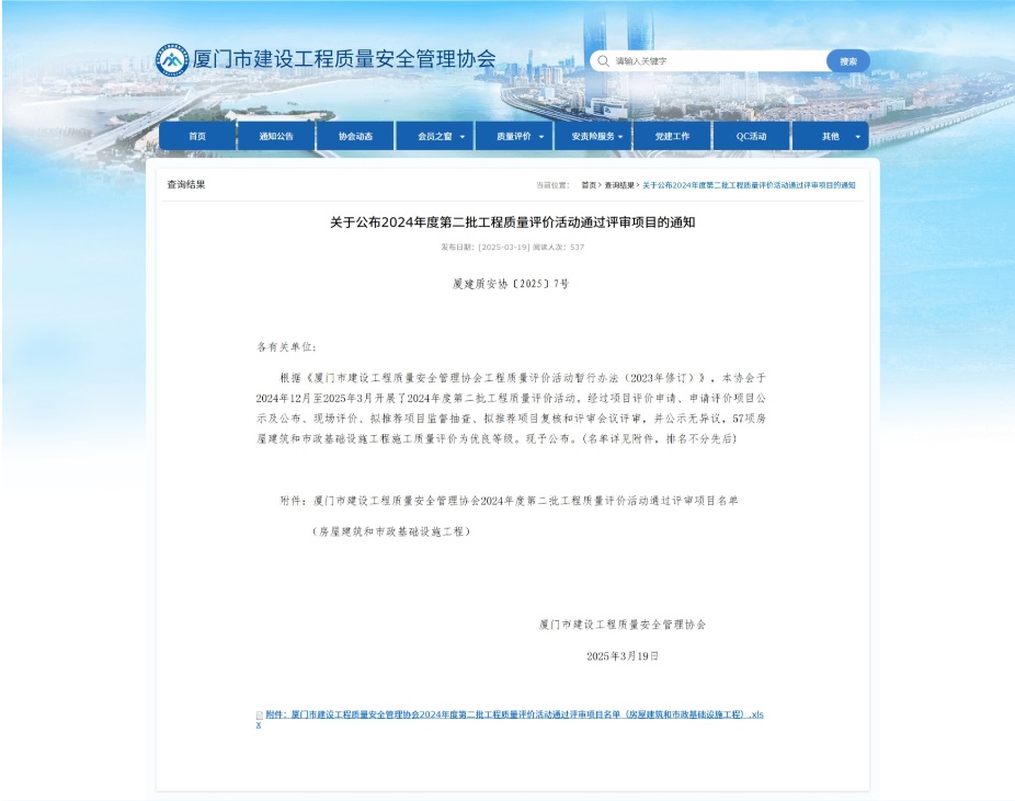 2025年3月19日,廈門市建設工程質(zhì)量安全管理協(xié)會公布《關于公布2024年度第二批工程質(zhì)量評價活動通過評審項目的通知》,國貿(mào)地產(chǎn)在本次評選中,憑借卓越的工程品質(zhì)與創(chuàng)新管理模式脫穎而出。