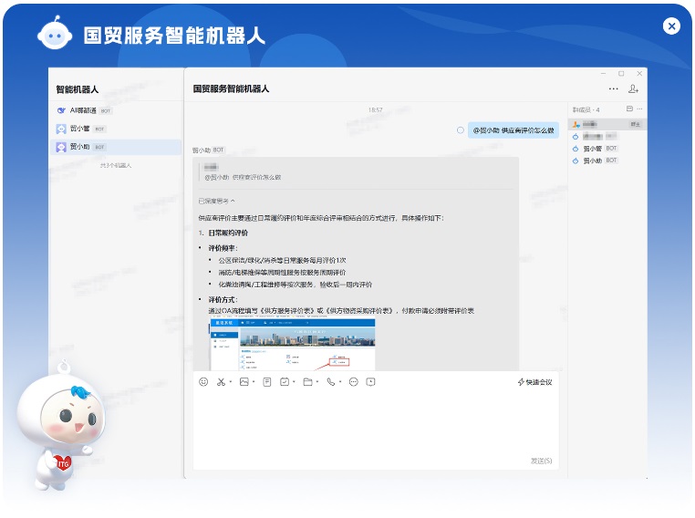 值得一提的是,面對(duì)當(dāng)下AI科技創(chuàng)新涌動(dòng)的時(shí)代浪潮,國(guó)貿(mào)服務(wù)于近日依托企業(yè)微信,成功接入DeepSeek,正式推出“AI員工”智能機(jī)器人“貿(mào)小助”,開(kāi)啟工作模式向智能化、數(shù)據(jù)驅(qū)動(dòng)化轉(zhuǎn)變的探索嘗試。隨著應(yīng)用的深入,這位“AI員工”展現(xiàn)出持續(xù)進(jìn)化的特質(zhì)。后續(xù)智能機(jī)器人還將陸續(xù)加入由國(guó)貿(mào)服務(wù)建立的梯位業(yè)主群,輔助提供咨詢服務(wù),高效響應(yīng)客戶訴求,持續(xù)提升客戶滿意度。
