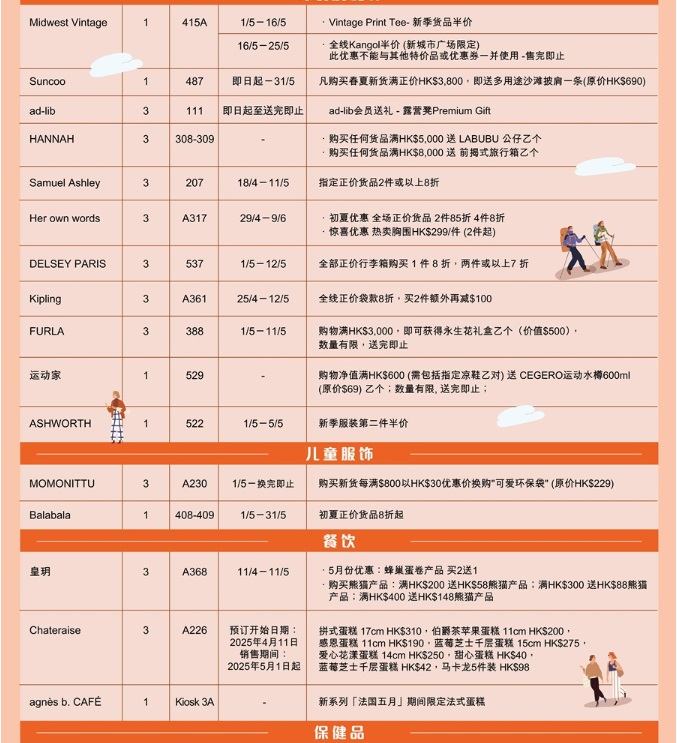 全場近40個品牌商戶為這次黃金周推出獨家優(yōu)惠,尤其Sasa 即日起至5月15日的限時激賞,精選近300款熱門爆品低至25折發(fā)售,讓你買得盡興。品質(zhì)女裝Theory在黃金周期間也推出限定獨家優(yōu)惠,購滿指定金額低至75折;高爾夫?qū)I(yè)服裝品牌 Ashworth即日起至5月5日也有購買新款衣服第二件半價的黃金周限時優(yōu)惠,優(yōu)惠多多,驚喜不斷。